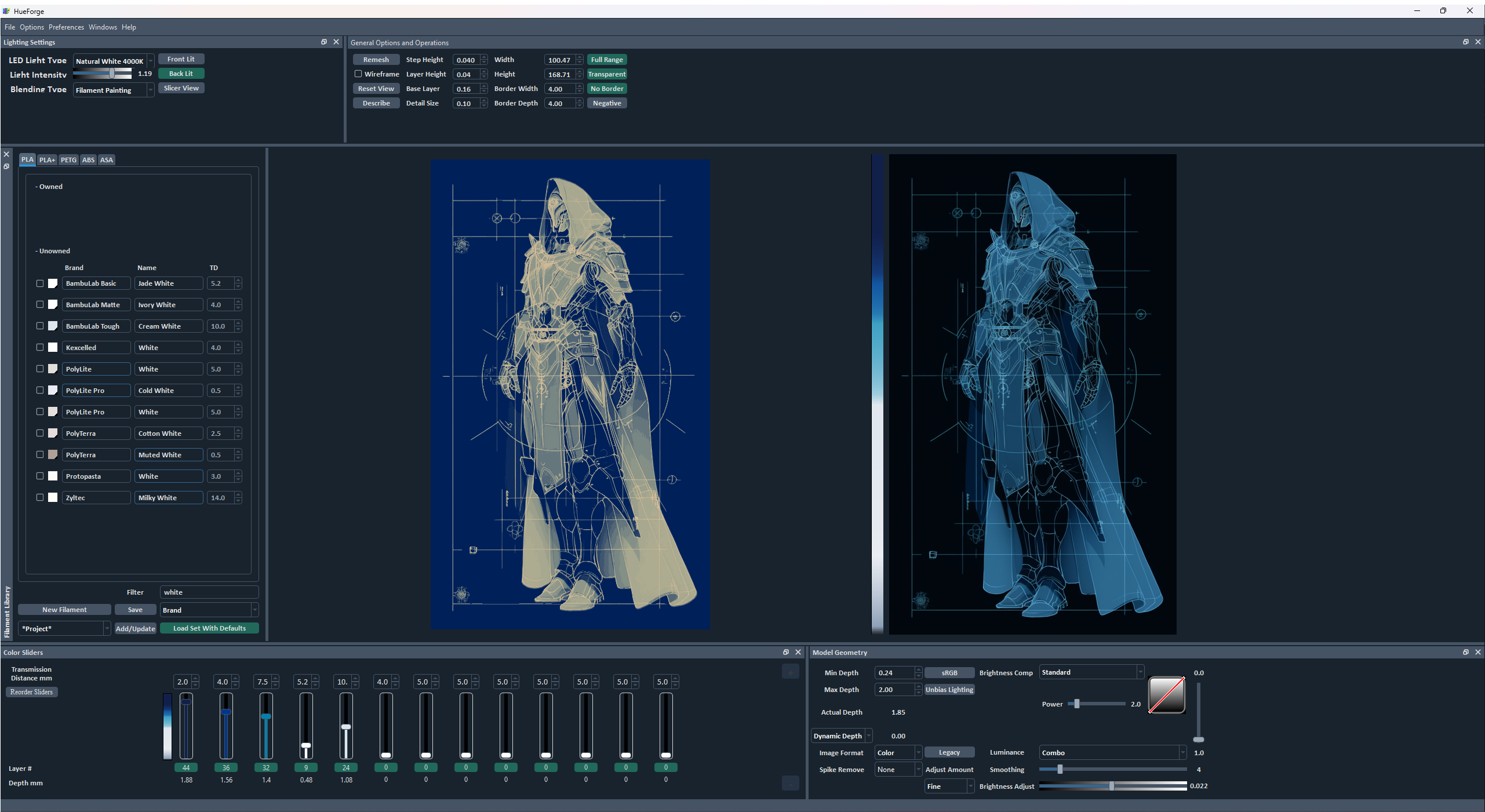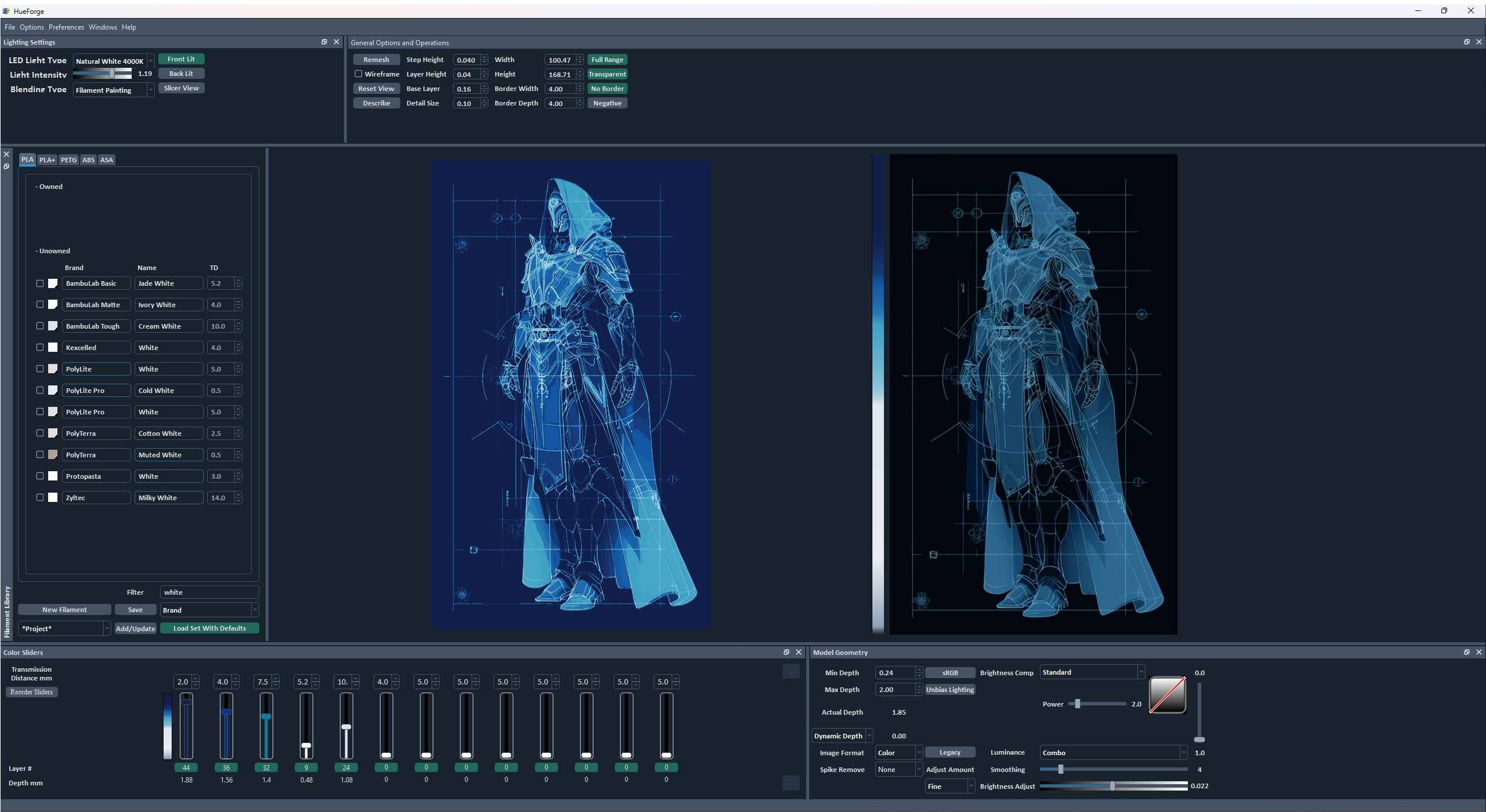 The old mysterious “Normal” button has been moved to the Lighting Settings along with the Blending Type (yes I see that the font is chopped off on the bottom it’s on my list). I’ve broken it into 3 buttons though. Now you can view ANY HueForge model through a Front Lit, Back Lit, or Slicer View blending mode. (Previously it was only your current mode’s blending and Slicer view). Why would you want to do this? If you uncheck Negative when making a filament painting, you’ve effectively made a Lithophane, but previously there was no way to predict what that lithophane would look like (aside from the convoluted process of loading the STL by itself and setting the display to Lithophane mode, but that isn’t a reasonable workflow).