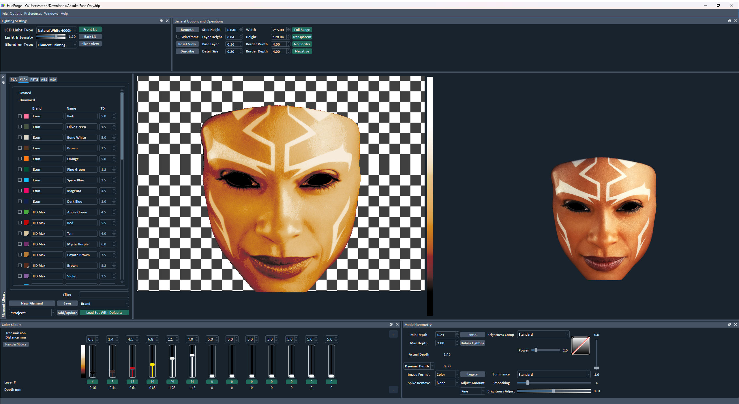 And you can attempt to optimize the look for both versions, or just change your mind and make a Lithophane instead! It works in both modes so you can see how good or goofy your lithophane will look when frontlit too.
